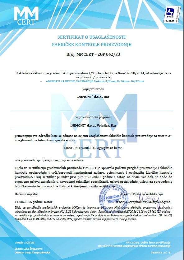 Factory production control is carried out according to the AVCP (Assessment and Verification of Constancy of Performance) system 2+, which involves stricter controls of the production process and product quality. In this way, we ensure the consistency of the quality of our stone aggregates and compliance with the laws of Montenegro and the EU.